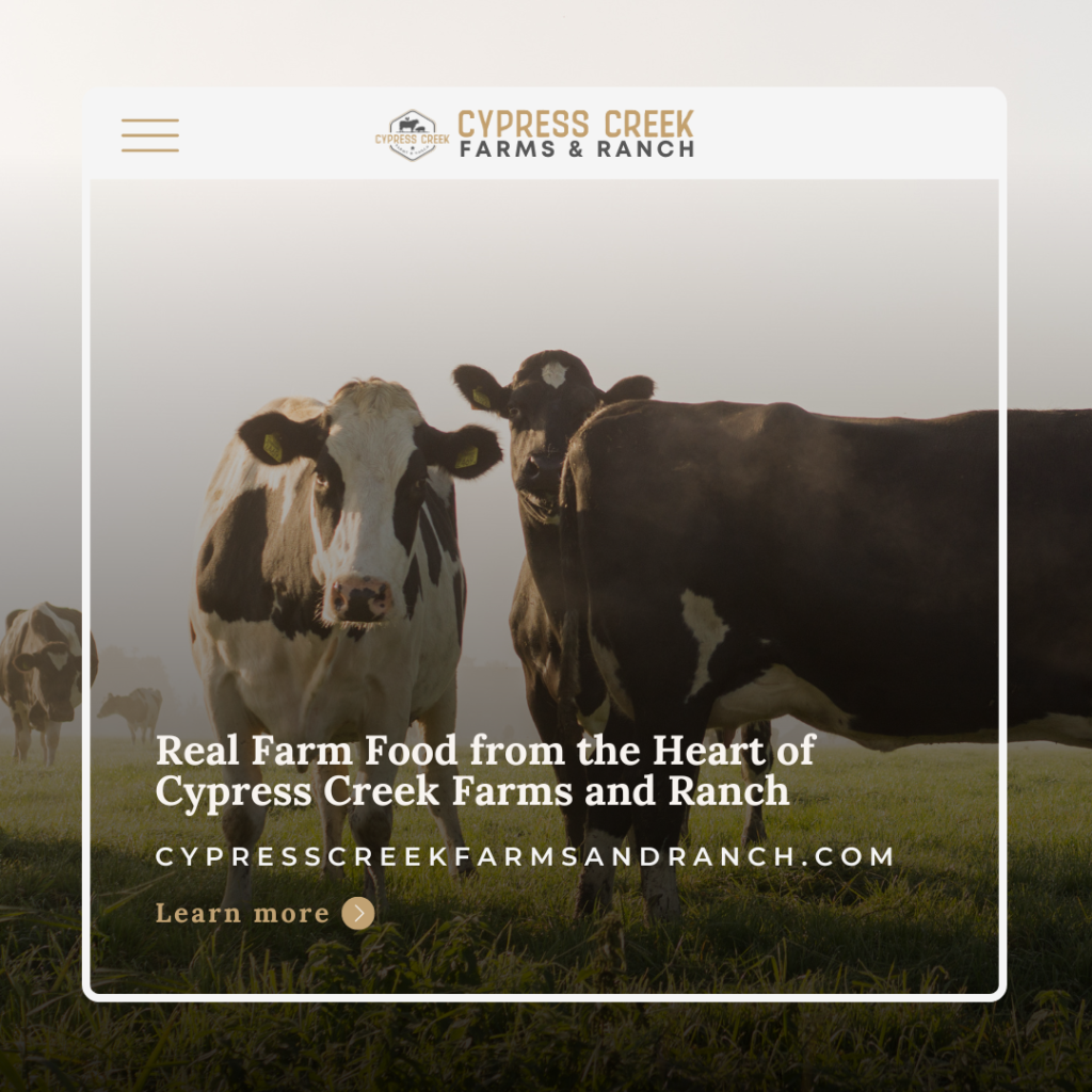 At Cypress Creek Farms and Ranch, we’re redefining what it means to eat well. Rooted in ethical farming and sustainability, our 70-acre family-run farm delivers fresh, seasonal, and eco-friendly products straight to your table. From pasture-raised meats to vibrant produce, every item reflects our deep commitment to quality, transparency, and community.